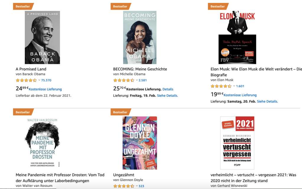 Wieso steht der „Spiegel Bestseller“ aus dem Kopp Verlag auf der Amazon-Seite über politische Bücher zwischen den Amazon Bestsellern – ohne aber selbst als Amazon Bestseller gekennzeichnet zu sein? (Screenshot vom 16.2.2021)